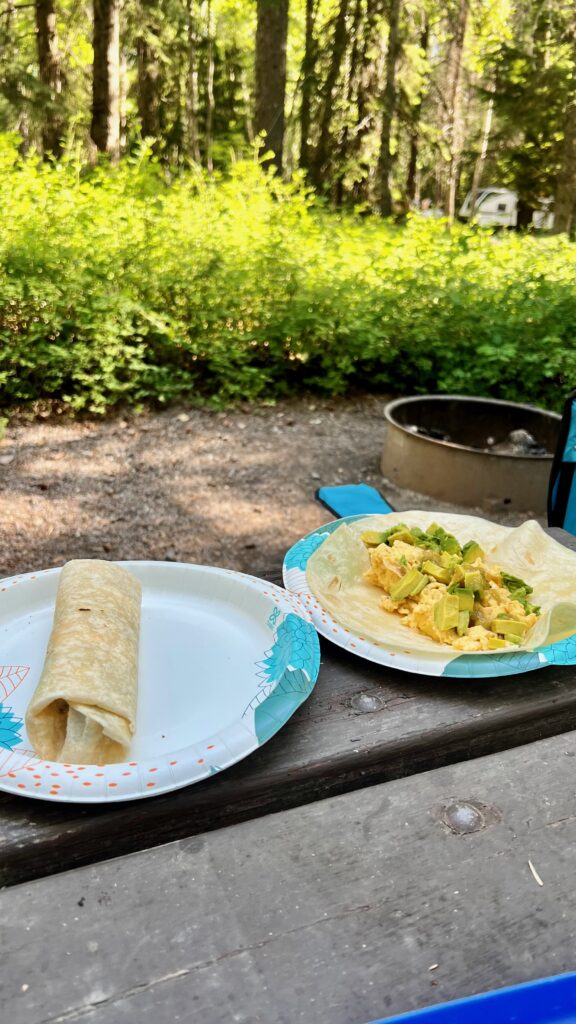 - Saturday Breakfast: scrambled eggs, breakfast tacos/burritos, or something similar. Coffee, we like Alpine Start because of the ease, and it is actually pretty dang good. Just boil water, pour in the coffee, and stir.
